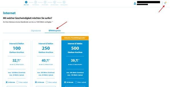 1b) Nun wählen Sie Ihren Wunschtarif: Die Aktion ist nur gültig für die Tarife "Internet & Telefon 500" oder "Internet & Telefon 1000". (Weitere Details siehe im Download des Flyers oben.)